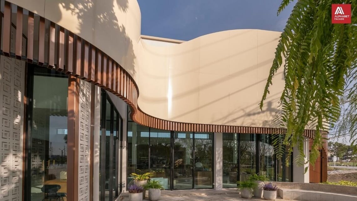 เน้นวัสดุที่ทนแดดฝน ทำความสะอาดง่าย และผิวไม่เงามาก (ลดการสะท้อนรถ/สายไฟ) เช่น ผิวด้าน ลายไม้ หรือแผ่นเจาะรูที่ช่วยสร้างแสง–เงาและเพิ่มมิติให้ภาพ